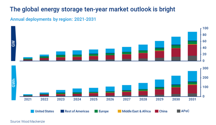 該公司在最新一期的“全球儲能市場展望更新”季度版報告是指出,到2031年,全球儲能市場累計部署的儲能系統(tǒng)總裝機(jī)容量將達(dá)到500GW,其中美國和中國占到75%。