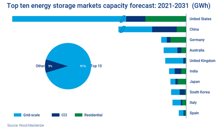 如下圖所示,美國和中國將在2021~2031年主導(dǎo)全球儲能市場,而全球十大市場將占同期新增儲能容量的91%。在德國、印度和日本以外的大多數(shù)國家和地區(qū),電網(wǎng)規(guī)模儲能系統(tǒng)將是增長的最主要的部分,其中住宅和商業(yè)和工業(yè)(C&I)的儲能系統(tǒng)將占大部分。