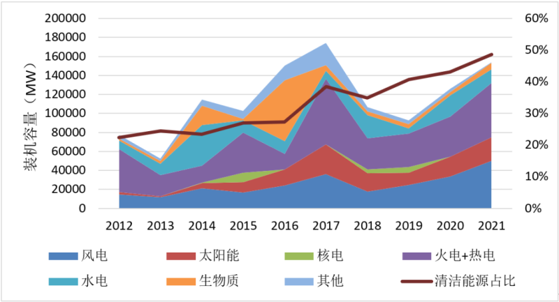 圖1 十年來各類型機(jī)組裝機(jī)容量變化及清潔能源占比趨勢