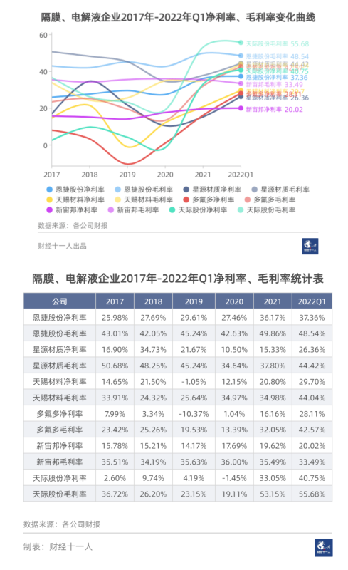 但是利潤率數(shù)據(jù)表明,隔膜與電解液才是悶聲賺大錢的典型,特別是隔膜。作為隔膜的兩家龍頭企業(yè),恩捷股份是濕法隔膜的霸主,占據(jù)45%以上的市場份額。干法隔膜的龍頭星源材質同樣擁有近乎壟斷的優(yōu)勢,占據(jù)全國近半市場。而這兩家企業(yè)的利潤率數(shù)據(jù)十分亮眼,毛利率超過40%,凈利率在20%-30%,且十分穩(wěn)定,幾乎未受到近幾年原材料價格大幅波動的影響。