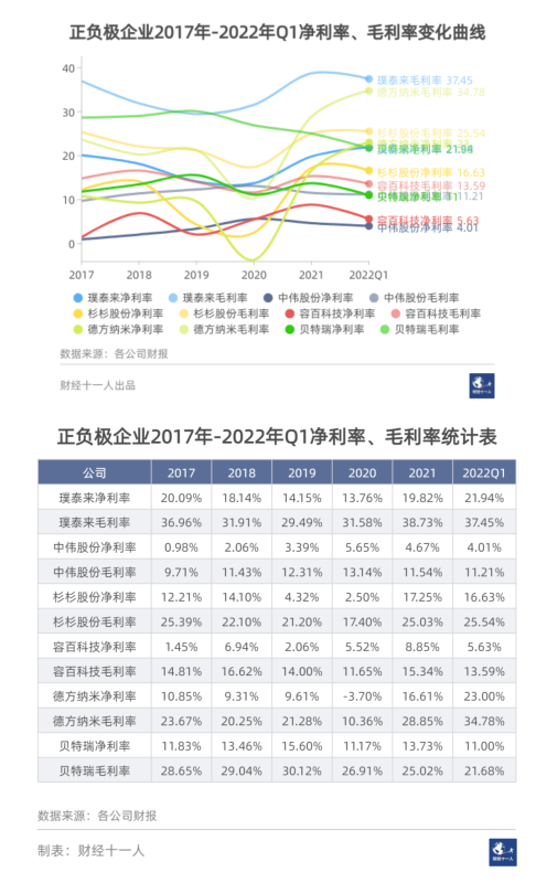 正負極是動力電池重要的上游產業(yè)。該產業(yè)在這輪動力電池市場熱潮中的收益頗豐,但這種收益是建立在此前的低起點之上的。放大到5年為周期,會發(fā)現(xiàn)2022年一季度代表性正負極企業(yè)的利潤率水平與2017年的水平基本相當。5年時間,以2020年為最低點,正負極企業(yè)的利潤率呈現(xiàn)V形曲線。