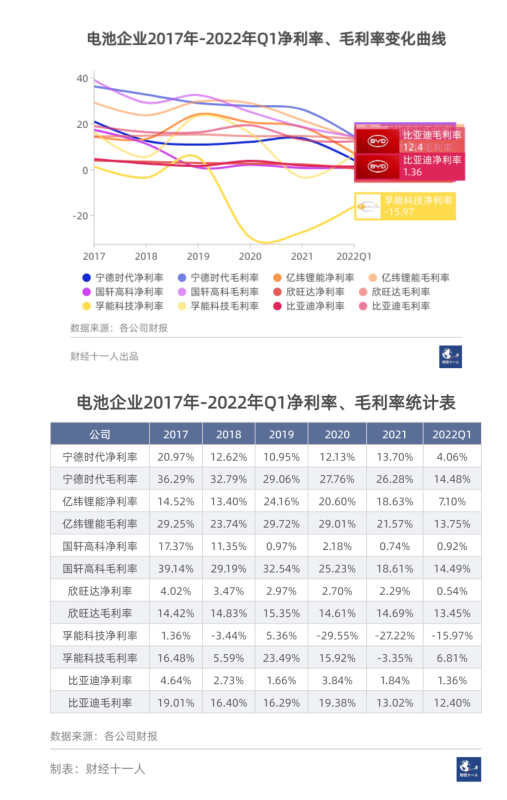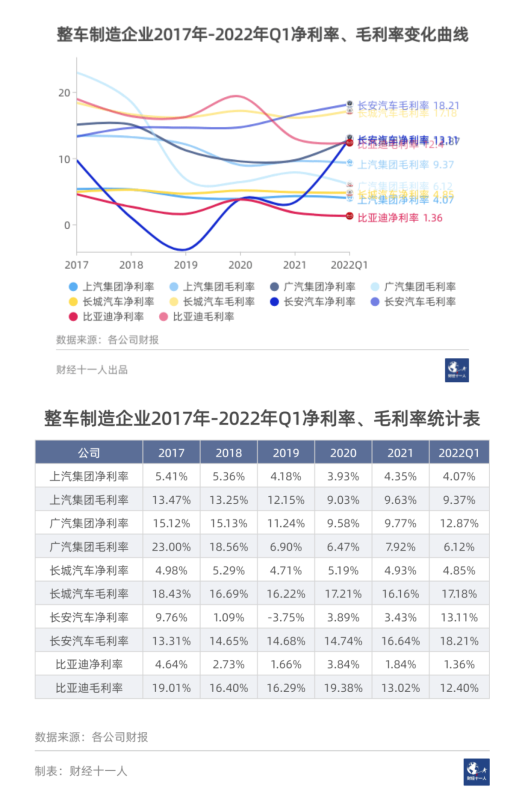 雖然整車廠都在抱怨動力電池等上游供應商的價格上漲給它們帶來了巨大壓力,但從毛利率和凈利率上看,這種影響尚不明顯,主要原因是這些大型汽車集團目前的營收和利潤依然主要來自燃油車,受動力電池價格變動影響有限。但電池成本上升對新能源車制造商的影響就比較明顯,例如已經全盤切換到新能源車的比亞迪,以及造車新勢力。