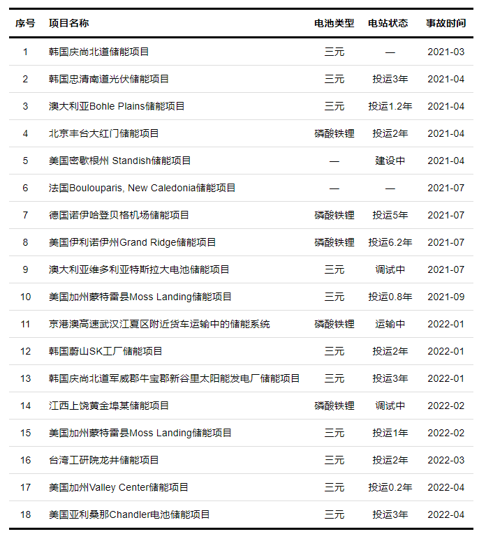 從項目狀態(tài)來看,投運1年及以上的事故10起,投運不足1年的2起,運輸中1起,建設(shè)調(diào)試中的3起,其余2起狀態(tài)未知;從電池類型來看,其中三元鋰離子電池事故最多,共11起,磷酸鐵鋰5起,其余2起電池類型未知。