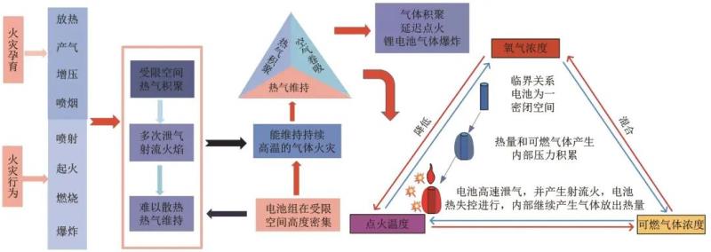 綜上可知,熱失控演化過程中,鋰離子電池副反應(yīng)既會產(chǎn)生熱量,又會產(chǎn)生氣體。電池溫度的升高是熱量積累的結(jié)果,電池內(nèi)壓增高是氣體在電池殼密閉空間積聚的結(jié)果。當(dāng)熱量和氣體積累到一定程度時,電池安全閥打開,噴出大量氣體,可燃?xì)怏w和空氣迅速混合。熱失控繼續(xù)進(jìn)行,化學(xué)反應(yīng)速率迅速加快使升溫速率和氣體產(chǎn)生速率驟升,滿足著火條件時,電池發(fā)生起火燃燒。當(dāng)然,也有可能是高速率泄氣過程中產(chǎn)生的電火花點(diǎn)燃可燃?xì)怏w引發(fā)的燃燒。對于儲能電站而言,局部燃燒產(chǎn)生之后,大量高溫可燃有毒混合煙氣會發(fā)生氣體流動運(yùn)移現(xiàn)象,當(dāng)可燃?xì)怏w在受限空間積聚到一定程度時,遇到點(diǎn)火源,發(fā)生氣體爆炸。