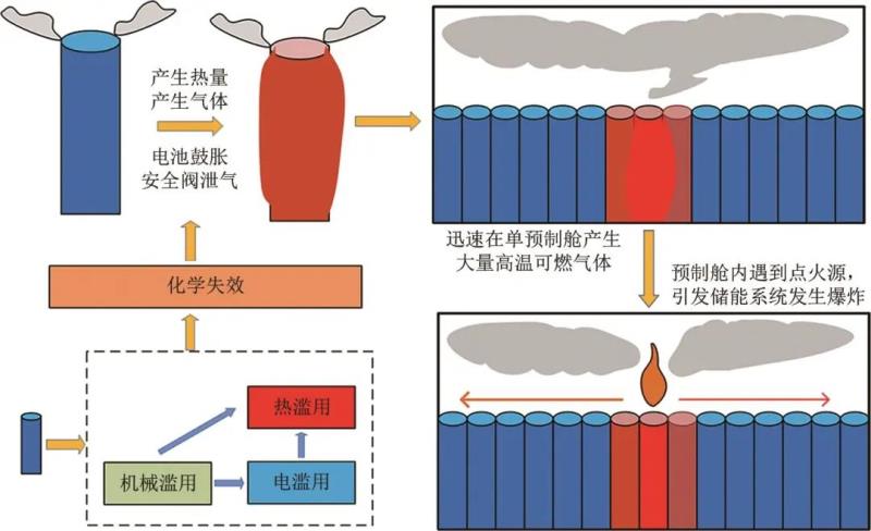 儲能電站鋰離子電池的火災(zāi)爆炸事故,主要是電池單體發(fā)生內(nèi)短路后使得電池?zé)崾Э仄鸹鹑紵?,進(jìn)一步熱失控擴(kuò)展到相鄰電池,從而形成大規(guī)?;馂?zāi),在受限空間中氣體積聚到一定程度時,遇到點(diǎn)火源,又會發(fā)生爆炸。盡管鋰離子電池存在自引發(fā)內(nèi)短路致使熱失控的風(fēng)險,但是概率很低,僅為百萬分之一。一般認(rèn)為,熱失控是在外部誘發(fā)條件如熱濫用、電濫用、機(jī)械濫用下造成的。儲能電站鋰離子電池發(fā)生熱失控時,電池間會發(fā)生熱失控蔓延,進(jìn)一步引發(fā)大規(guī)模的電池燃燒,如圖1所示。