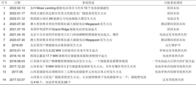 鋰離子電池目前被廣泛應(yīng)用于儲能領(lǐng)域,儲能電站火災(zāi)爆炸事故頻發(fā)引發(fā)了人們對電化學(xué)儲能電站安全性的極大關(guān)注。鋰離子電池是儲能電站電能的能量載體,其電極體系組分具有很高的熱危險性,封裝成電池后其熱危險性加劇。2021年4月,北京豐臺區(qū)儲能電站發(fā)生爆炸事故,造成兩名消防員死亡,使得公眾對儲能電站的應(yīng)用前景擔(dān)憂。近年來發(fā)生的儲能電站火災(zāi)爆炸事故如表1所示。