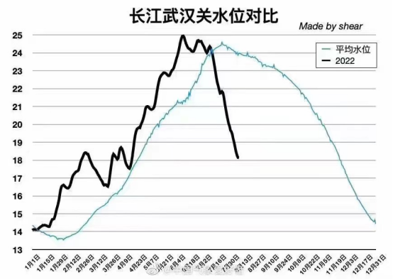 從水利角度來看,今年旱情嚴重,嚴重影響了長江流域的水量。6月中旬以來,長江流域降水由偏多轉(zhuǎn)為偏少,其中,6月下旬偏少2成,7月偏少3成多,尤其是長江下游干流及鄱陽湖水系偏少5成左右,為近10年同期最少。