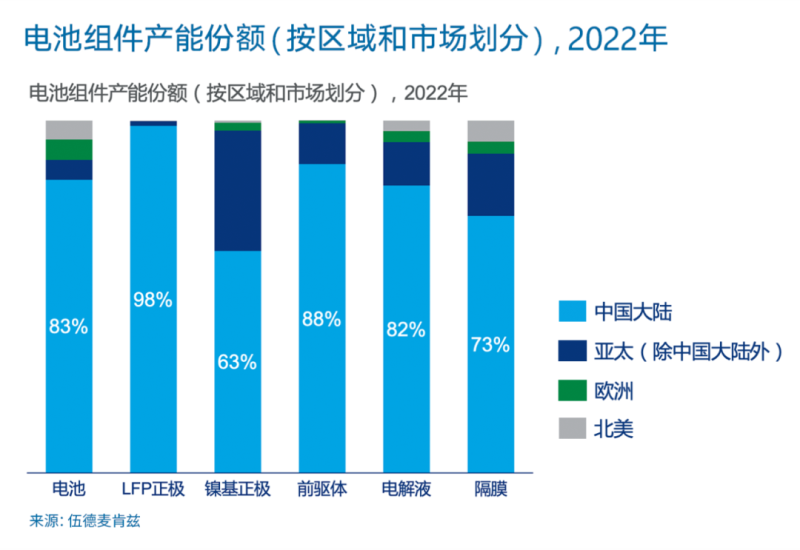 中國在電池組件的生產(chǎn)中占主導地位,在每個環(huán)節(jié)都至少占60%的全球市場份額。目前,鎳鈷錳三元鋰電池供應仍占電動車市場的46%和儲能系統(tǒng)市場的55%。2022年,磷酸鐵鋰(LFP)電池的市場份額有望從2021年的25%增加到27%。在未來十年中,所有的電池組件產(chǎn)能都將有強勁的增長,尤其是到2030年,電解液的增長將達到4.5倍。
