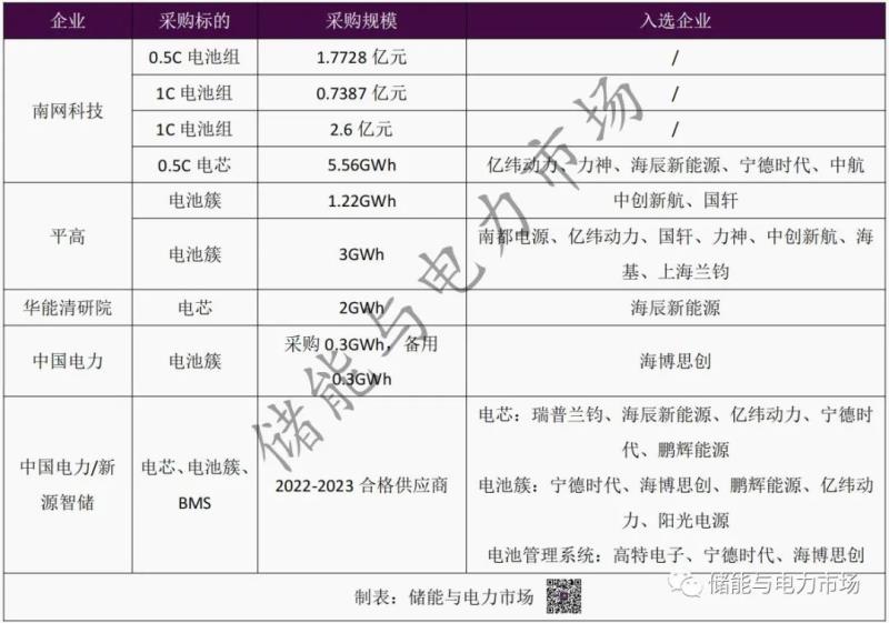 在儲能電芯和電池簇集采方面,南網(wǎng)科技、平高、華能清研院、中國電力等四家企業(yè)率先啟動采購,并開展了儲能系統(tǒng)集成產(chǎn)線的建設(shè)工作。從采購規(guī)模來看,南網(wǎng)科技電池組采購規(guī)模最大,超5.56GWh。