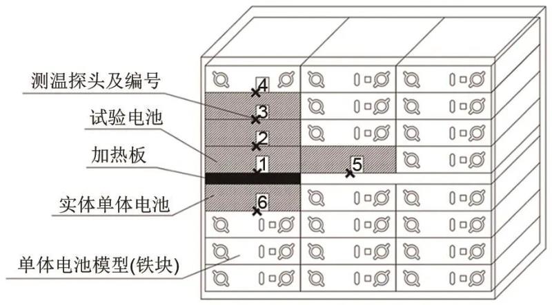 試驗(yàn)所用電池簇模型均采用全尺寸模型,包括:?jiǎn)误w鋰電池選用容量為150 Ah的方形磷酸鐵鋰電池(產(chǎn)品實(shí)體),外形尺寸為174 mm×170 mm×48 mm;試驗(yàn)用電池模組(電池箱)模型尺寸為655 mm×510 mm×190 mm,內(nèi)部布置如圖3所示,其中實(shí)體電池5塊,其余位置為等尺寸模型替代;電池簇模型尺寸為1781 mm×658 mm×2369 mm。電池簇中,除試驗(yàn)電池模組外,實(shí)際工況擺放的其他電池模組均為空箱,見圖4。將電池簇模型放置于儲(chǔ)能電池試驗(yàn)方艙內(nèi),儲(chǔ)能電池試驗(yàn)方艙尺寸為3500 mm×2450 mm×3200 mm,見圖3~4。選定某塊單體電池為試驗(yàn)電池,在其下部安裝加熱設(shè)備,并在試驗(yàn)電池周圍布置多個(gè)測(cè)溫裝置,監(jiān)測(cè)相鄰位置處電池的溫度和電池箱內(nèi)溫度,見圖3。全氟己酮滅火劑通過6只霧化噴頭注入,霧化噴頭布置在電池簇后側(cè)。