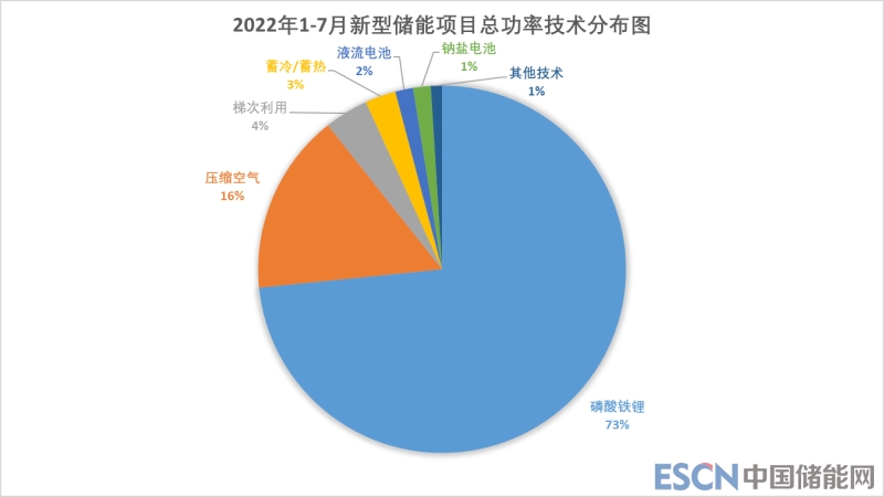 新型儲能項目依舊以電化學(xué)儲能項目為主,占比近80%,其中電化學(xué)儲能項目儲能技術(shù)絕大多數(shù)我磷酸鐵鋰儲能,占比達(dá)90%以上,是現(xiàn)在電化學(xué)儲能項目所采用的主要技術(shù)。此外,壓縮空氣項目的潛能逐漸體現(xiàn),2022年1-7月規(guī)劃中、建設(shè)中的壓縮空氣項目裝機功率總量占比16%,共4.2GW,我國發(fā)展壓縮空氣儲能還具有巨大潛力。