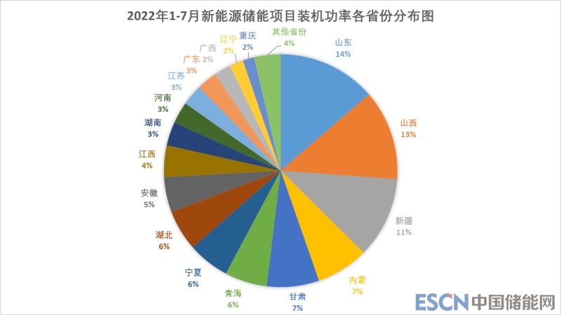由各省份新能源項目額定功率分布圖可以看出,2022年1-7月新能源儲能項目額定裝機功率Top10省份為山東、山西、新疆、內(nèi)蒙、甘肅、青海、寧夏、湖北、安徽、江西,其中山東、山西和新疆三個省份裝機功率遙遙領(lǐng)先,總占比近38%。