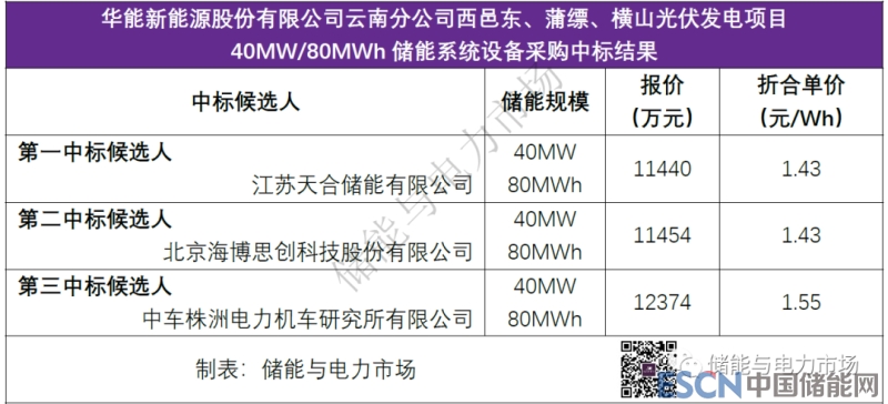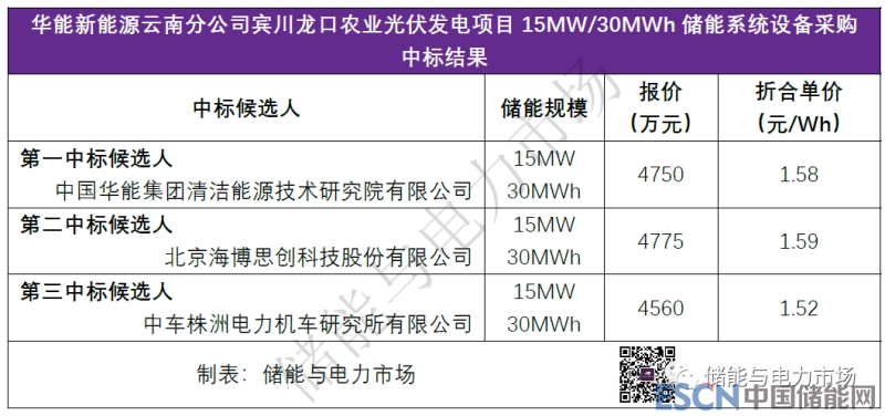 賓川龍口農(nóng)業(yè)光伏發(fā)電項(xiàng)目15MW/30MWh儲(chǔ)能系統(tǒng)設(shè)備采購(gòu)項(xiàng)目,中國(guó)華能集團(tuán)清潔能源技術(shù)研究院有限公司以總價(jià)4750萬(wàn)元,折合單價(jià)1.58元/Wh,成為第一中標(biāo)候選人。