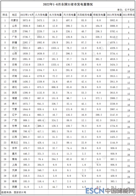 根據(jù)國家統(tǒng)計(jì)局的數(shù)據(jù)顯示,在2021年,我國的發(fā)電總量達(dá)到81121.8億千瓦時(shí),累計(jì)增長(zhǎng)8.1%。2022年1-6月,全國發(fā)電量為39631億千瓦時(shí),累計(jì)增長(zhǎng)0.7%。上半年發(fā)電量排在前十名的省份依次是:內(nèi)蒙古、山東、江蘇、廣東、新疆、四川、山西、浙江、云南、河北,發(fā)電量均超過1500億千瓦時(shí)。上半年發(fā)電量前十的省份,在2021年同樣位居前十名。