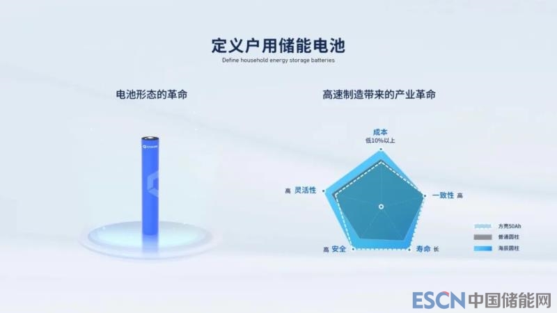 海辰儲能除在電力儲能專用電池做了新品布局,也重新定義戶用儲能專用電池,推出大圓柱電池產品,從高速制造和電池形態(tài)可定制,帶來戶儲產業(yè)大變革。