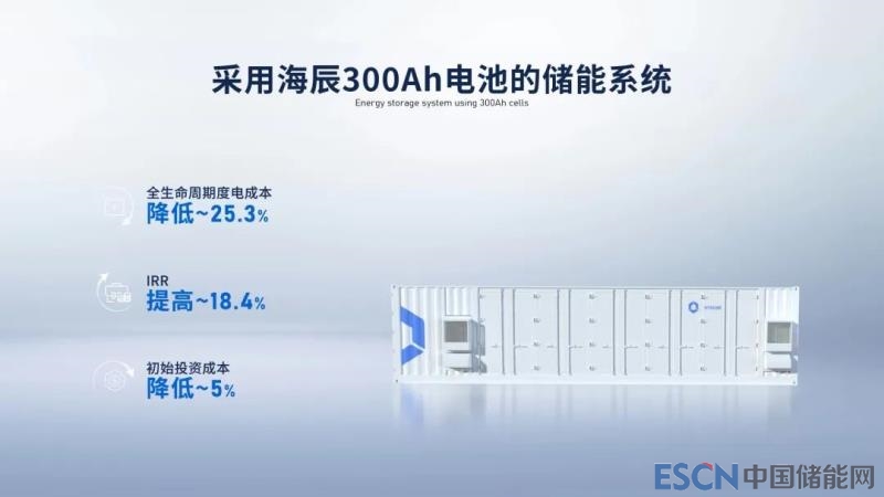 采用海辰儲能300Ah電力儲能專用電池的儲能系統,相較當下280Ah儲能電池,可以實現全生命周期度電成本降低25.3%;如果以用戶側儲能電站,按照一天一充應用場景下,可實現IRR(內部收益率)提高18.4%;前三年儲能系統總放電量增加5%,從而減少電量超配,實現初始投資節(jié)省5%。該款產品從以上三個方面帶來顯著收益,縮短儲能項目回本周期,大幅提升投資回報率。