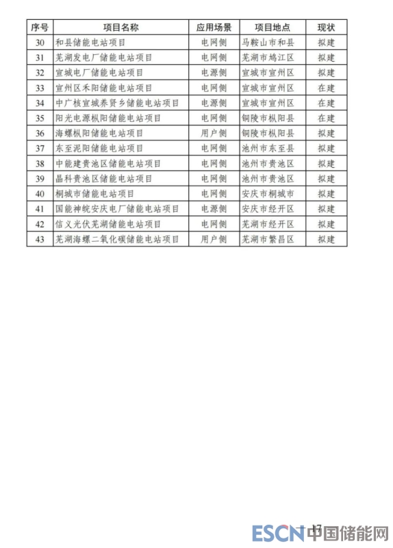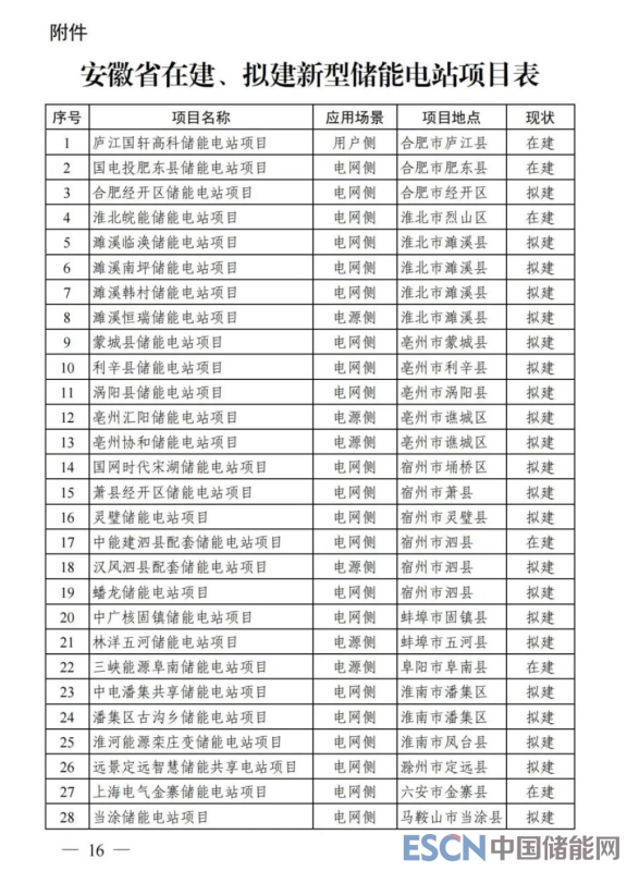 《方案》對(duì)安徽省的現(xiàn)有儲(chǔ)能裝機(jī)規(guī)模進(jìn)行了統(tǒng)計(jì),對(duì)擬建、在建的儲(chǔ)能電站進(jìn)行了全面梳理,截至2021 年底,安徽省已投運(yùn)新型儲(chǔ)能設(shè)施裝機(jī)規(guī)模22.4 萬(wàn)千瓦/26.0 萬(wàn)千瓦時(shí),其中“風(fēng)電+儲(chǔ)能”項(xiàng)目裝機(jī)20.5 萬(wàn)千瓦/20.5 萬(wàn)千瓦時(shí)。