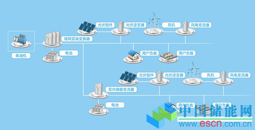 通過匯川IBD100系列微網(wǎng)雙端變換器將柴油機(jī)發(fā)電、光伏發(fā)電、風(fēng)力發(fā)電設(shè)備以及蓄電池等電源設(shè)備進(jìn)行并網(wǎng)聯(lián)接,構(gòu)建新型綠色智能微型電網(wǎng),可以給用戶負(fù)載提供較高質(zhì)量的電能,即使脫離了配電網(wǎng),仍可以獨(dú)立運(yùn)行。