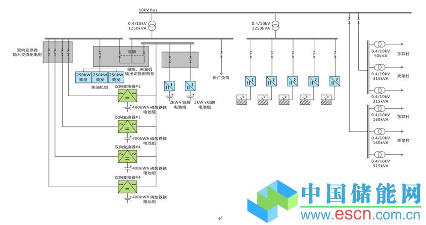 柴油發(fā)電機(jī)組由2臺(tái)250kW和1臺(tái)500kW的柴油發(fā)電機(jī)組成。4臺(tái)250kVA雙向變換器構(gòu)成微網(wǎng)主干網(wǎng),其中兩臺(tái)雙向變換器分別配備400kWh磷酸鐵鋰電池,另兩臺(tái)分別配備900kWh鉛酸電池。為保證系統(tǒng)儲(chǔ)能容量另配置2臺(tái)250kW的儲(chǔ)能變流器,每臺(tái)儲(chǔ)能變流器配備2MWh鉛酸電池,此微電網(wǎng)系統(tǒng)總存儲(chǔ)能量可達(dá)6.6MWh。