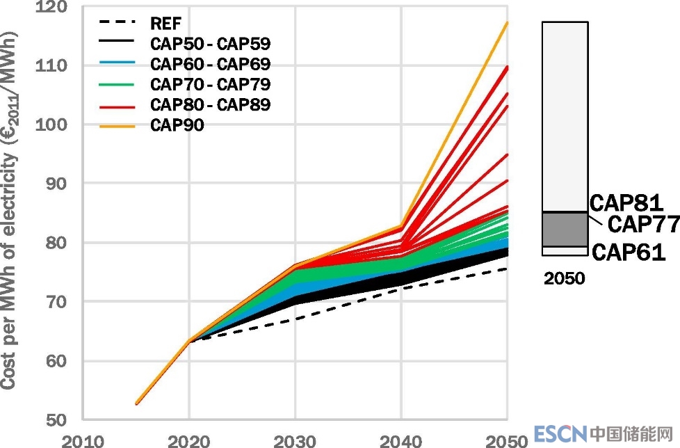 如果在2050年實現(xiàn)溫室氣體減排相對1990年碳排放的90%,在可行路徑下,在2030年和2040年電力生產(chǎn)成本將相對于對照情景增加13%和15%,而到2050年,這一差異可能會增加到55%。模型中的對照情景表達(dá)了在歐洲碳排放交易計劃下,二氧化碳定價直到2050年保持不變的能源系統(tǒng)演變路徑 [12]。