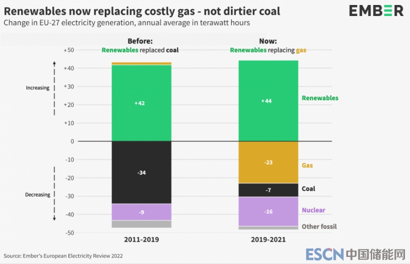 2021年下半年,由于俄烏沖突影響了歐洲天然氣的供應(yīng),天然氣價格飆升,歐盟基本上中斷了煤炭發(fā)電的淘汰進(jìn)程。EMBER《歐洲電力評論2022》顯示,2011-2019年平均每年煤電量下降34太瓦時,作為補(bǔ)充的可再生能源發(fā)電量增加了42太瓦時,但是2021年在可再生能源發(fā)電量增加量基本穩(wěn)定的情況下,煤電量只下降了7太瓦時,而天然氣發(fā)電量減少了23太瓦時 [6]。也就是說2021年,歐盟新增的可再生能源發(fā)電量取代的是短缺的天然氣發(fā)電,而不是煤炭發(fā)電。