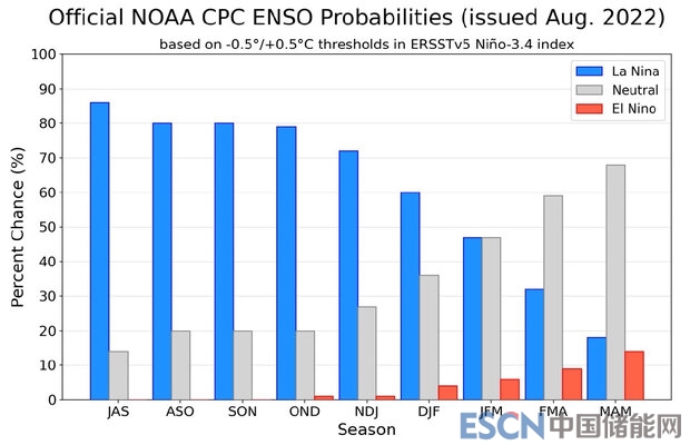圖2 美國氣候預(yù)測中心未來ENSO發(fā)生的概率預(yù)報,藍(lán)色柱表示“拉尼娜”事件發(fā)生概率,紅色柱表示“厄爾尼諾”事件發(fā)生概率,灰色柱表示中性年發(fā)生概率 | 圖源:美國國家大氣與海洋管理局
