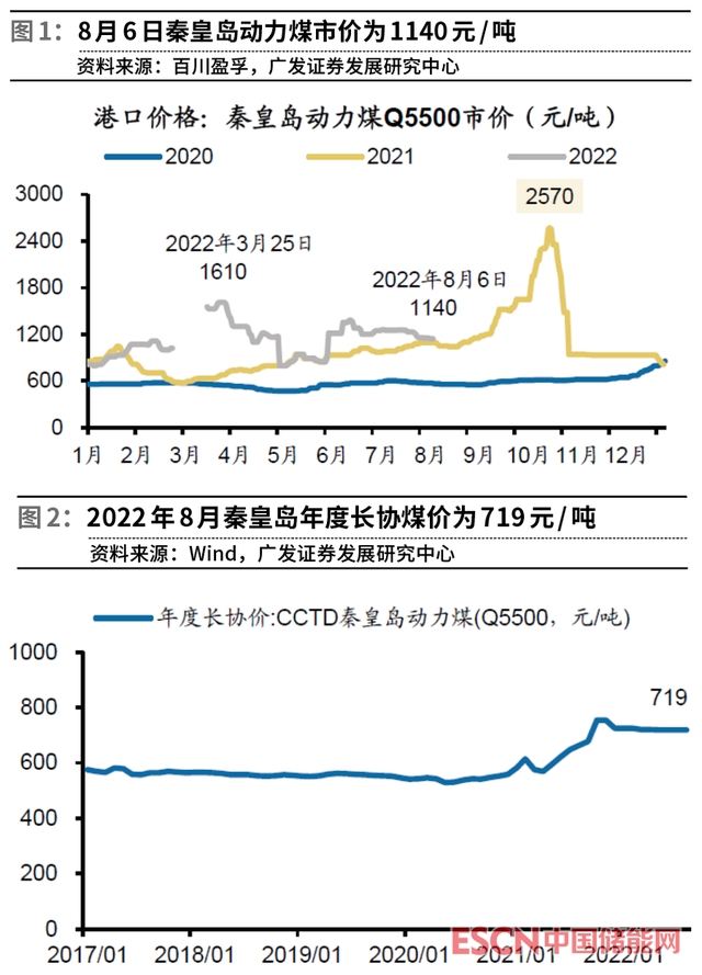 另一方面,國務院出臺多項措施保障煤炭供應,原煤產量持續(xù)提升,2022年至今原煤單月產量均實現(xiàn)超10%以上的同比增速。價格方面,2022年8月6日秦皇島5500大卡動力煤市場價為1140元/噸,較3月高點已下降470元/噸;8月秦皇島5500大卡動力煤年度長協(xié)煤價為719元/噸,環(huán)比繼續(xù)持平。