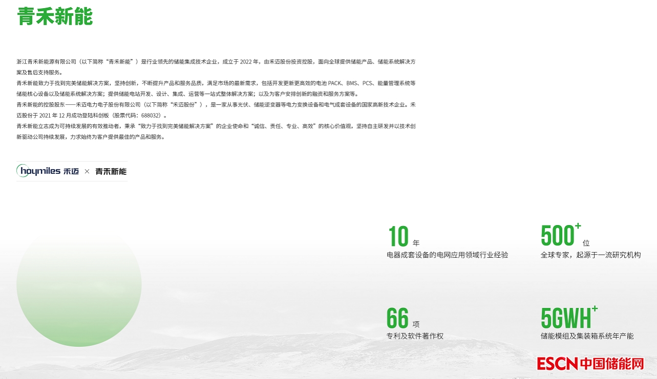 中國儲能網(wǎng)訊:浙江青禾新能源有限公司是行業(yè)領先的儲能集成技術企業(yè),成立于 2022 年,由禾邁股份投資控股,面向全球提供儲能產(chǎn)品、儲能系統(tǒng)解決方案及售后支持服務。