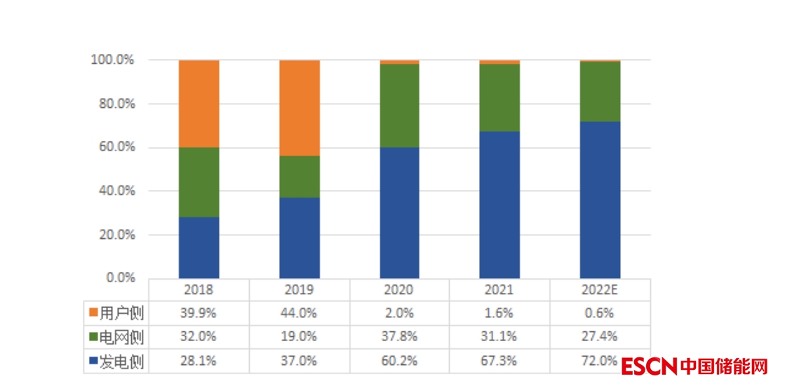 電化學儲能產(chǎn)業(yè)鏈下游的應(yīng)用場景主要有發(fā)電側(cè)、電網(wǎng)側(cè)和用戶側(cè)儲能等。近幾年間,我國發(fā)電側(cè)電化學儲能裝機占下游應(yīng)用領(lǐng)域總裝機的比重不斷增長,而用戶側(cè)的電化學儲能裝機占比呈現(xiàn)下降趨勢,此外,由于成本疏導等問題,電網(wǎng)對電化學儲能的熱衷度并不如抽水蓄能。隨著新能源的快速發(fā)展,儲能電站的需求規(guī)模越來越大,電化學儲能應(yīng)用場景將越來越豐富。