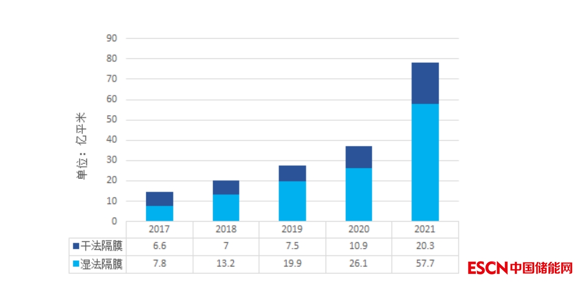 2021年,我國鋰離子電池隔膜出貨量78億平方米,同比增長超100%,全球市場占有率突破70%。其中,受市場對電池能量密度要求提升影響,疊加產(chǎn)能持續(xù)釋放,濕法隔膜牢牢占據(jù)市場主導地位,出貨量占比上升至74%。