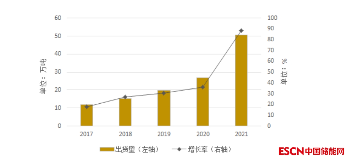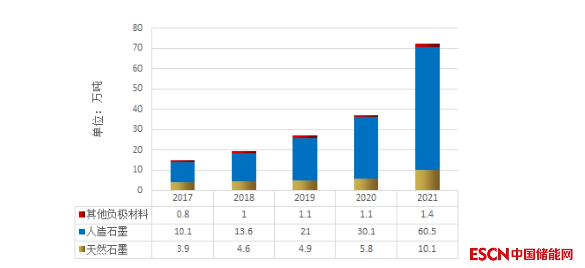2021年,在鋰離子電池市場快速增長的帶動下,鋰離子電池負極材料出貨量大幅增長至72萬噸,同比增長94.6%,市場規(guī)模達159.1億元。此外,受全球鋰離子電池市場需求增長拉動,我國負極材料出口超15萬噸,較上年增長超1倍。業(yè)內(nèi)預(yù)計,2022年我國負極材料仍將保持大幅增長態(tài)勢,出貨量將超120萬噸。