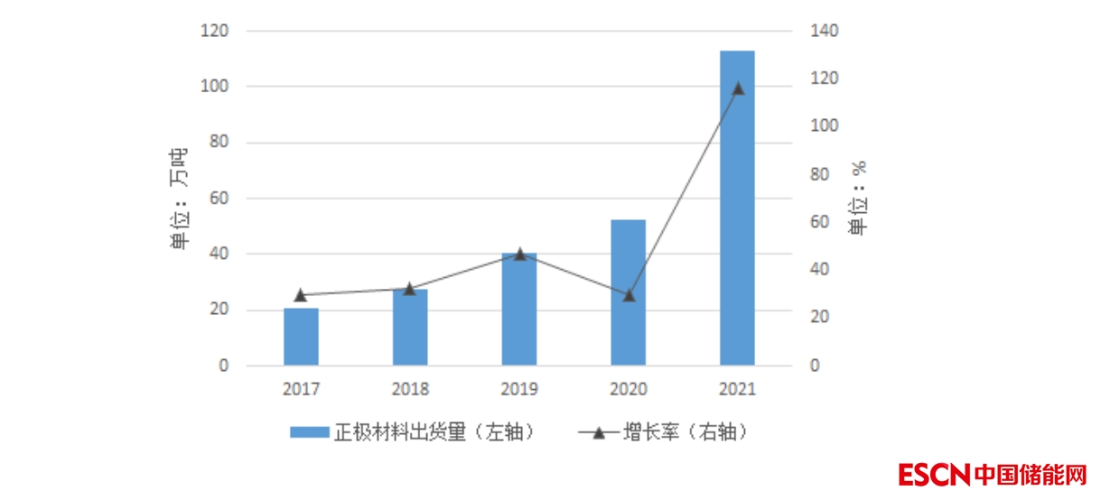 根據(jù)高工產(chǎn)業(yè)研究院(GGII)數(shù)據(jù),2021年我國鋰離子電池正極材料市場出貨量為113萬噸,同比增長116%,市場規(guī)模達877.1億元。其中,受儲能市場出貨量快速增長影響(同比增長超110%),磷酸鐵鋰正極材料出貨量達48萬噸,同比增長258%,市場占比由24%上升至43%。業(yè)內(nèi)預(yù)計,2022年我國正極材料市場規(guī)模將突破千億大關(guān)。