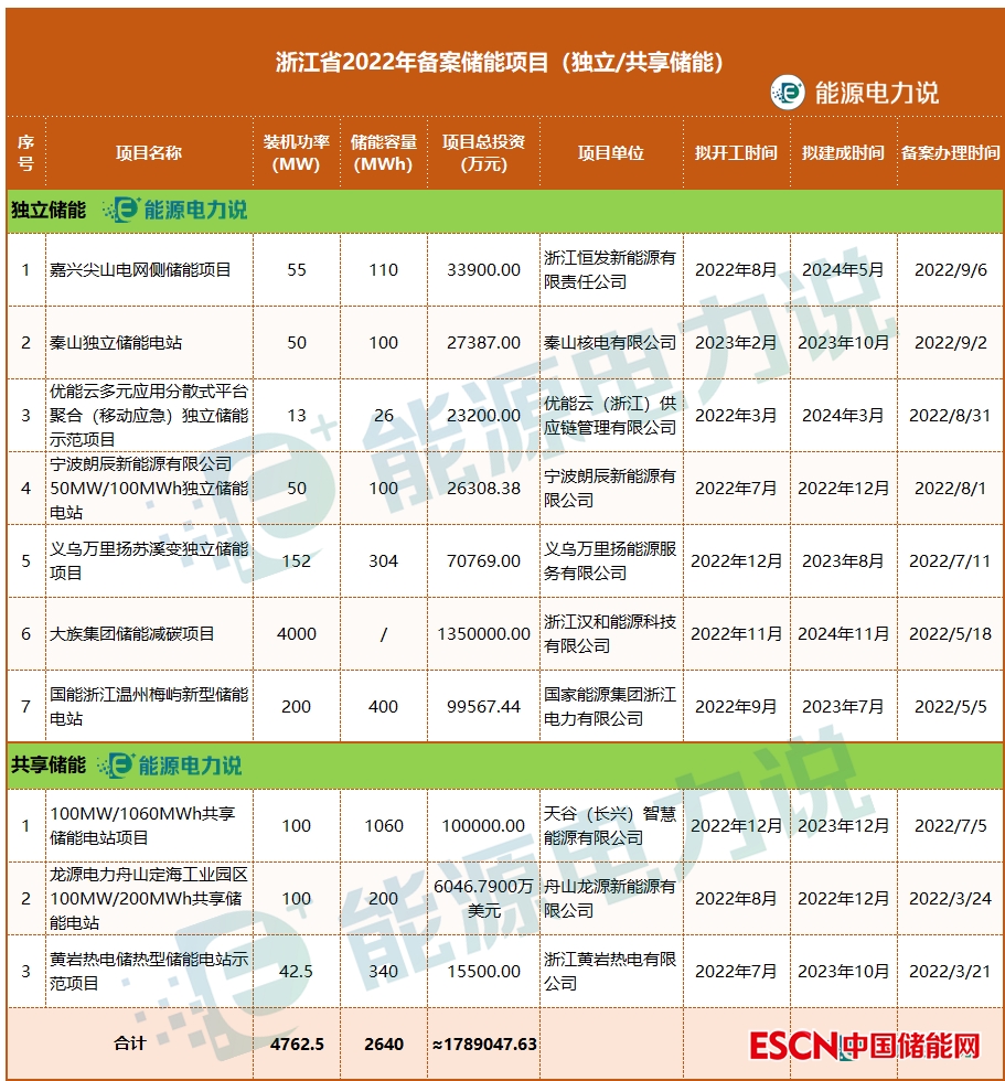 在已備案的152個儲能項目中,獨立儲能項目7個,總規(guī)模約4.5GW,總投資金額約163.1億元;共享儲能項目3個,總?cè)萘考s1.6GWh,總投資金額約15.8億元。建設(shè)單位包括國家能源集團、中核電、龍源等下屬公司,以及優(yōu)能云(浙江)供應(yīng)鏈管理有限公司、浙江漢和能源科技有限公司、天谷(長興)智慧能源有限公司等公司。