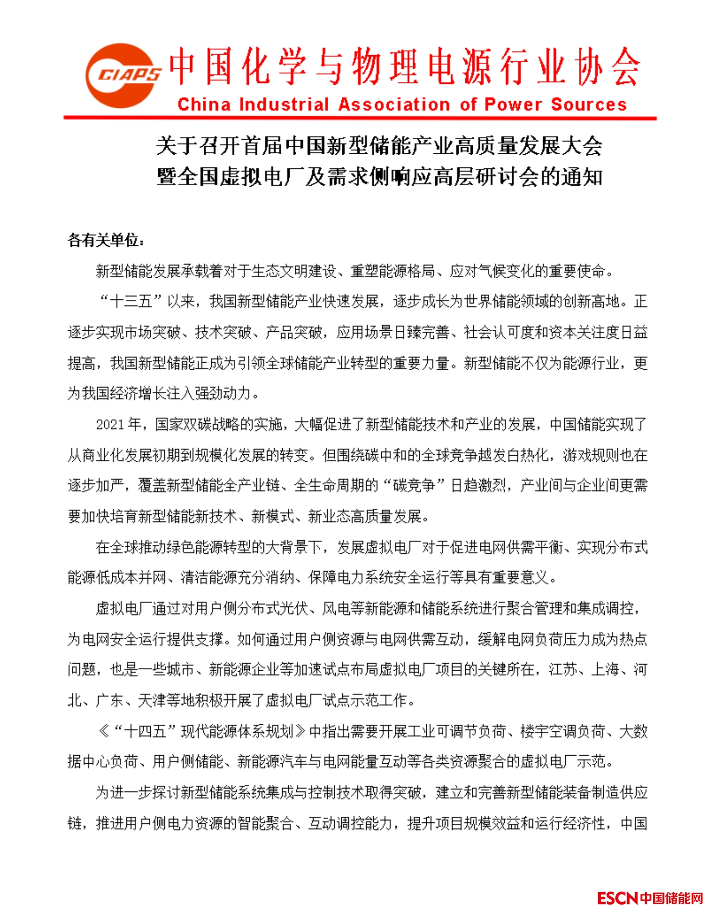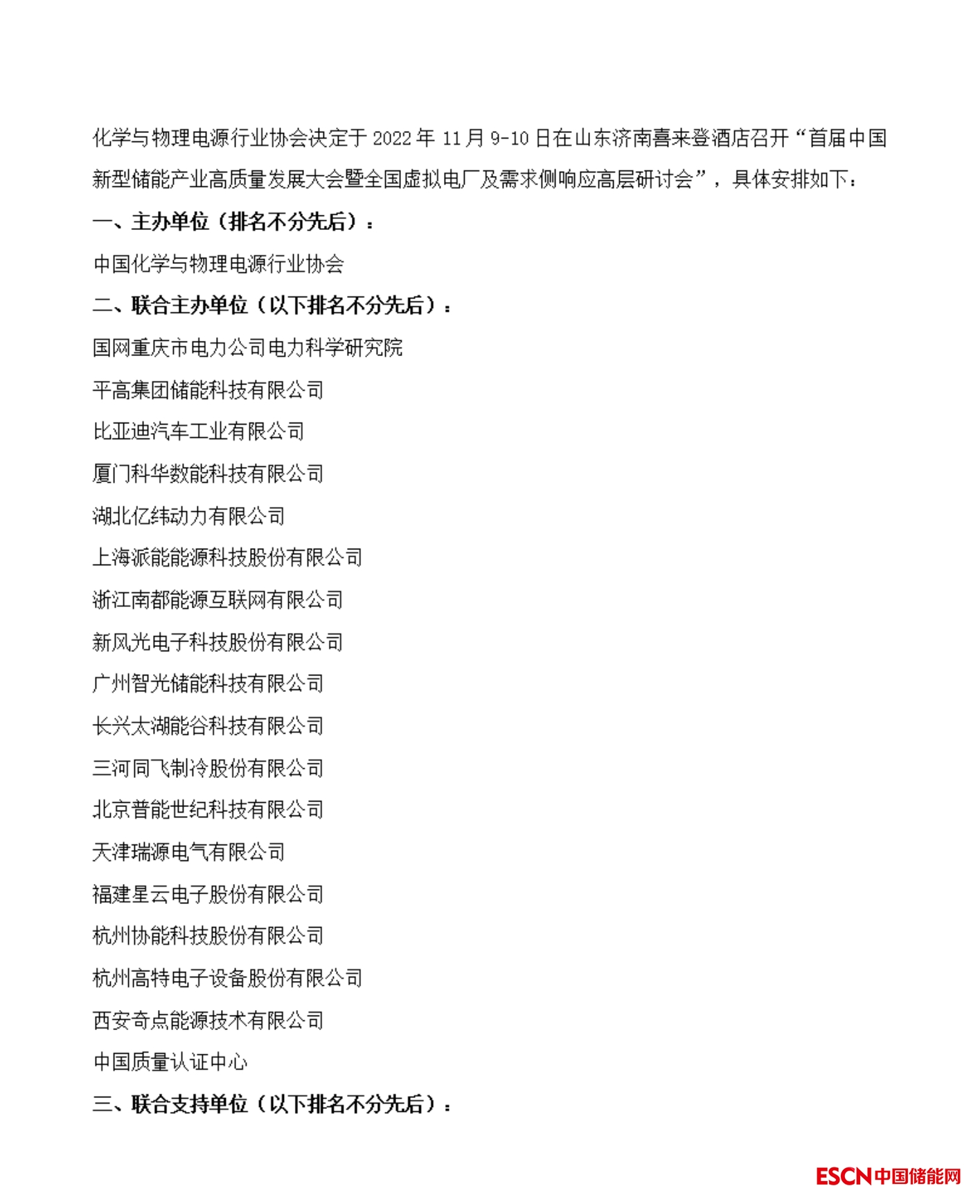 為進(jìn)一步探討新型儲能系統(tǒng)集成與控制技術(shù)取得突破,建立和完善新型儲能裝備制造供應(yīng)鏈,推進(jìn)用戶側(cè)電力資源的智能聚合、互動調(diào)控能力,提升項目規(guī)模效益和運(yùn)行經(jīng)濟(jì)性,中國化學(xué)與物理電源行業(yè)協(xié)會決定于2022年11月9-10日在山東濟(jì)南喜來登酒店召開“首屆中國新型儲能產(chǎn)業(yè)高質(zhì)量發(fā)展大會暨全國虛擬電廠及需求側(cè)響應(yīng)高層研討會”,具體安排如下: