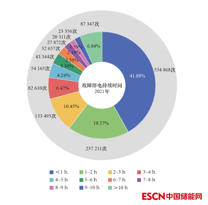 2021年,用戶故障停電平均持續(xù)時間為3.63 h/次,同比增加0.04 h/次。其中,城市地區(qū)用戶故障停電平均持續(xù)時間為3.43 h/次,同比增加0.17 h/次;農(nóng)村地區(qū)用戶故障停電平均持續(xù)時間為3.71 h/次,同比增加0.03 h/次。其中,41.88%的故障停電能夠在1 h以內排除并恢復供電;18.57%的故障停電能夠在2 h以內排除并恢復供電;6.84%的故障停電恢復時間超過了10 h。2021年故障停電持續(xù)時間分布情況見圖17。