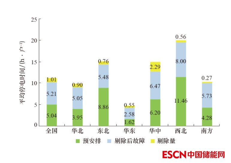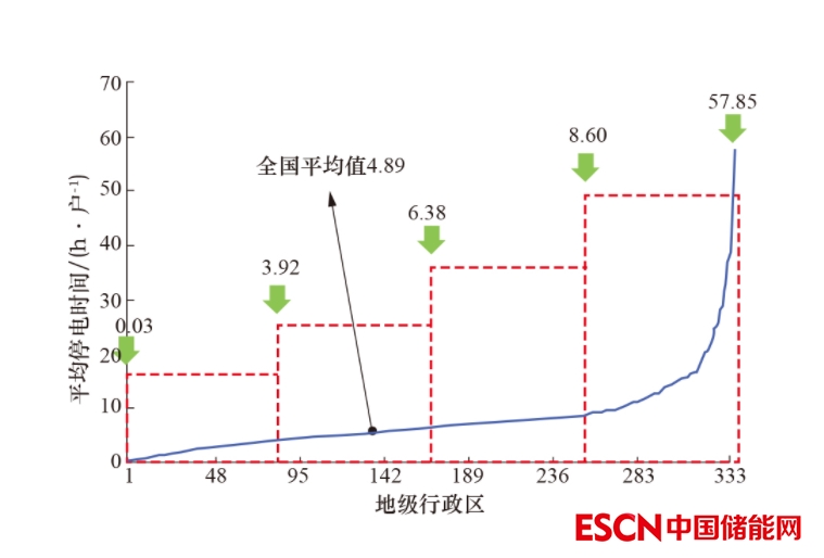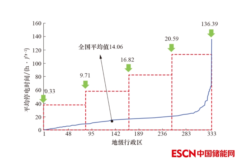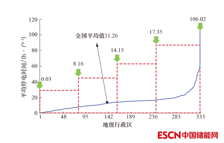 2021年,全國333個地級行政區(qū)中,20個地級行政區(qū)(占6.04%)的用戶平均停電時間少于2 h/戶, 147個地級行政區(qū)(占44.14%)的用戶平均停電時間超過15 h/戶,204個地級行政區(qū)(占61.26%)的用戶平均停電時間高于全國平均值(11.26 h/戶)。