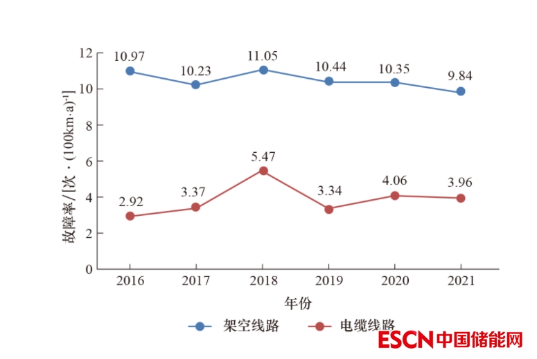 圖10 2016?2021年架空線路、電纜線路故障率變化情況