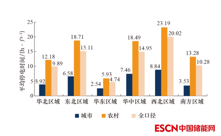 圖5 2021年各區(qū)域城市、農(nóng)村、全口徑供電系統(tǒng)用戶平均停電時間情況