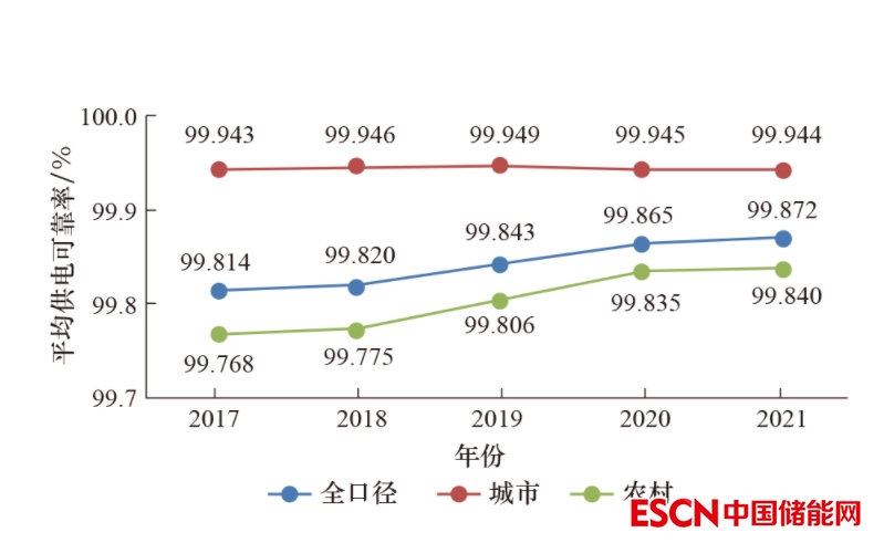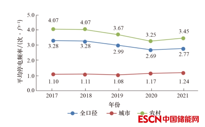 2021 年,全國供電系統(tǒng)用戶平均供電可靠率99.872%,同比上升0.007個百分點;用戶平均停電時間11.26 h/戶,同比減少0.61 h/戶;用戶平均停電頻率 2.77次/戶,同比增加0.08次/戶。其中,全國城市地區(qū)平均供電可靠率99.944%,農(nóng)村地區(qū)平均供電可靠率 99.840%,城市、農(nóng)村地區(qū)平均供電可靠率相差0.104個百分點;全國城市地區(qū)用戶平均停電時間4.89 h/戶,農(nóng)村地區(qū)用戶平均停電時間14.06 h/戶,城市、農(nóng)村地區(qū)用戶平均停電時間相差9.17 h/戶;全國城市地區(qū)用戶平均停電頻率1.24次/戶,農(nóng)村地區(qū)用戶平均停電頻率3.45次/戶,城市、農(nóng)村地區(qū)用戶平均停電頻率相差 2.21次/戶。