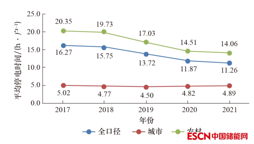 全國的用戶平均停電時間由2017年的16.27 h/戶下降至2021年的11.26 h/戶,下降了5.01 h/戶,其中城市地區(qū)的用戶平均停電時間由2017年的5.02 h/戶下降至 2021年的4.89 h/戶,下降了0.13 h/戶;農(nóng)村地區(qū)的用戶平均停電時間由2017年的20.35 h/戶下降至2021年的14.06 h/戶,下降了6.29 h/戶。2017?2021年全國平均停電時間變化情況見圖3。