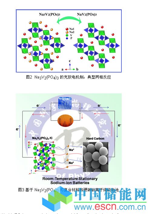 最近中國科學(xué)院物理研究所/北京凝聚態(tài)物理國家實(shí)驗(yàn)室(籌)清潔能源實(shí)驗(yàn)室E01組胡勇勝研究員和武漢理工大學(xué)陳文教授聯(lián)合培養(yǎng)的博士生簡澤浪等開發(fā)出一種新型Na3V2(PO4)3/C復(fù)合材料。作為鈉離子電池正極時,充放電平臺在3.4 V左右(如圖1所示),其儲鈉平均電壓高于目前報道的鈉離子電池正極材料。 Na3V2(PO4)3/C復(fù)合材料的可逆容量達(dá)到100 mAh/g以上,接近其理論容量(117 mAh/g),首周庫侖效率高達(dá)98%。原位XRD研究表明,該材料儲鈉機(jī)制為一典型的兩相( Na3V2(PO4)3 和NaV2(PO4)3)反應(yīng)(如圖2所示),其充放電過程中體積形變較小,約為8.3%。具有NASICON結(jié)構(gòu)的 Na3V2(PO4)3 (其中2個Na占據(jù)晶格中18e位置,1個Na占據(jù)6b位置)材料結(jié)構(gòu)穩(wěn)定,Na+離子在脫嵌過程中,主體結(jié)構(gòu)保持不變,循環(huán)穩(wěn)定,適合作為長壽命鈉離子儲能電池的正極材料,可以和硬碳等負(fù)極材料構(gòu)建室溫鈉離子電池(如圖3所示)。該工作發(fā)表在Electrochemistry Communications, 2012, 14: 86-89上,為該雜志過去90天內(nèi)下載量排前15名論文之一(http://www.journals.elsevier.com/electrochemistry-communications/most-read-articles/)。已申請了系列發(fā)明專利。相關(guān)工作得到了Advances In Engineering網(wǎng)站的報道。