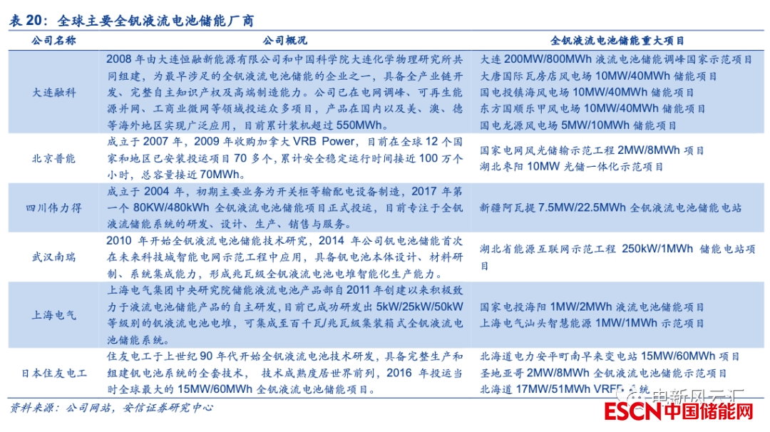 短期內(nèi)全釩液流電池的主要應(yīng)用場景為大規(guī)模電網(wǎng)側(cè)/發(fā)電側(cè)項(xiàng)目,投資主體為大型發(fā)電/電網(wǎng)企業(yè)。考慮到當(dāng)前國內(nèi)儲(chǔ)能最重要的驅(qū)動(dòng)因素為新能源發(fā)電側(cè)的強(qiáng)制配套要求,且全釩液流電池自身的初始投資成本相對較高,我們預(yù)計(jì)短期內(nèi)全釩液流電池儲(chǔ)能項(xiàng)目的投資將主要由大型發(fā)電企業(yè)或電網(wǎng)企業(yè)主導(dǎo)。目前大唐、國家電投、中廣核等大型電力集團(tuán)已經(jīng)啟動(dòng)了百M(fèi)Wh級別的全釩液流電池儲(chǔ)能項(xiàng)目建設(shè),華電、國網(wǎng)江蘇等亦在進(jìn)行示范性項(xiàng)目的嘗試,經(jīng)過前期項(xiàng)目的驗(yàn)證,未來全釩液流電池有望成為大型電力集團(tuán)重點(diǎn)布局的一類儲(chǔ)能形式。