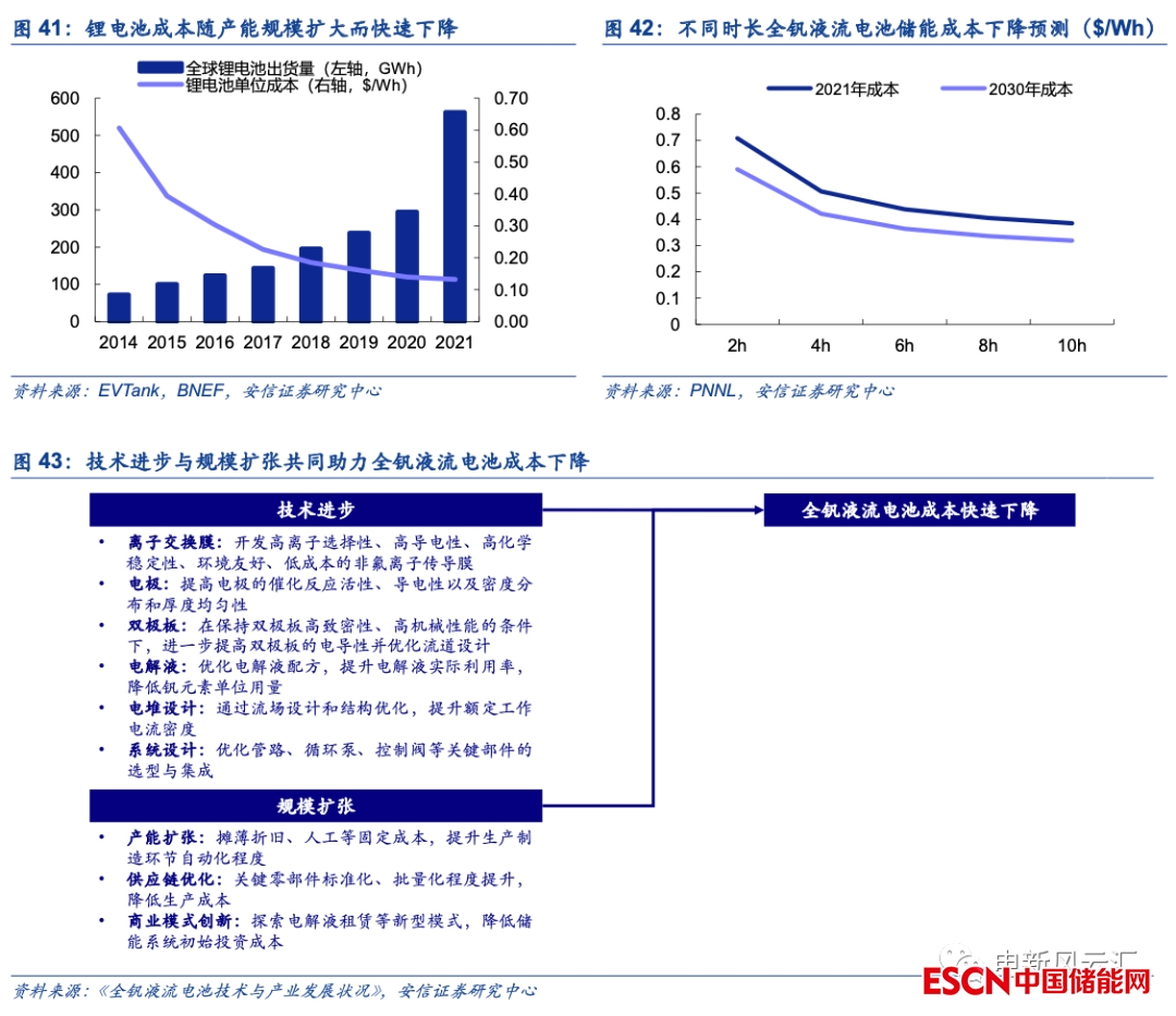 產(chǎn)業(yè)化進(jìn)程加速有望助力全釩液流電池成本持續(xù)下降?;仡欙L(fēng)電、光伏、鋰電等新能源產(chǎn)業(yè)的發(fā)展歷程,產(chǎn)能擴(kuò)大帶來的規(guī)模效應(yīng)是成本下降的重要驅(qū)動(dòng)因素。此前較低的產(chǎn)業(yè)化程度嚴(yán)重制約了全釩液流電池成本下降的速度,未來隨著產(chǎn)能的快速擴(kuò)張,無論是供應(yīng)鏈還是生產(chǎn)制造環(huán)節(jié)均有望實(shí)現(xiàn)成本的快速攤薄,行業(yè)或?qū)⑦M(jìn)入“產(chǎn)能擴(kuò)大-成本下降-需求提升-進(jìn)一步助推產(chǎn)業(yè)發(fā)展”的良性循環(huán)。根據(jù)美國太平洋西北國家實(shí)驗(yàn)室(PNNL)的預(yù)測,2030年全釩液流電池的初始投資成本(100MW/4h系統(tǒng))將由2021年的500美元/kWh以上降低至420美元/kWh左右,考慮到當(dāng)前的技術(shù)進(jìn)步與規(guī)模擴(kuò)張速度,我們認(rèn)為實(shí)際的降本速度有望更快。
