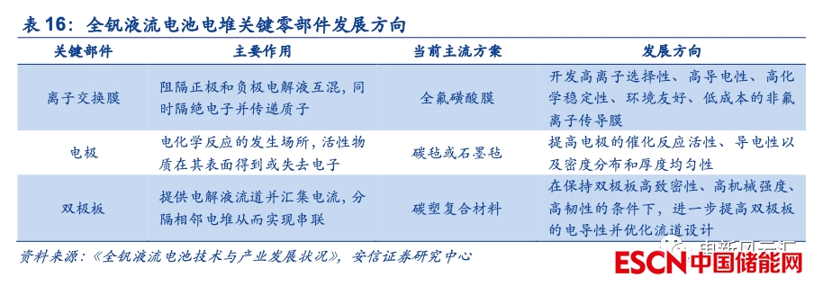現(xiàn)階段全釩液流電池電堆關(guān)鍵部件以廠商自產(chǎn)或定制為主,后續(xù)技術(shù)進(jìn)步以及規(guī)?;慨a(chǎn)將帶動(dòng)成本持續(xù)下行。相較于資源成本主導(dǎo)的能量單元(釩占據(jù)成本大頭),我們認(rèn)為功率單元未來存在較大的降本空間。一方面,關(guān)鍵部件以及系統(tǒng)設(shè)計(jì)層面的技術(shù)進(jìn)步將帶動(dòng)全釩液流電池電堆持續(xù)降本增效,例如開發(fā)高離子選擇性、高導(dǎo)電性、高化學(xué)穩(wěn)定性、低成本的離子交換膜,提升雙極板電導(dǎo)性,提高電極反應(yīng)活性以及導(dǎo)電性等。另一方面,現(xiàn)階段全釩液流電池產(chǎn)業(yè)整體規(guī)模有限,關(guān)鍵部件以全釩液流電池廠商自產(chǎn)或小批量定制為主,后續(xù)隨著生產(chǎn)規(guī)模的提升,整體的制造成本有望明顯攤薄。此外,從原理和構(gòu)成的角度出發(fā),全釩液流電池與氫燃料電池在關(guān)鍵材料(雙極板、離子膜、電極等)、電堆結(jié)構(gòu)以及生產(chǎn)設(shè)備等方面都存在較大的相似性,后續(xù)氫能產(chǎn)業(yè)的蓬勃發(fā)展也有望推動(dòng)相關(guān)產(chǎn)業(yè)鏈環(huán)節(jié)的快速成熟。