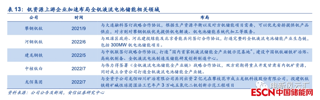 龍頭釩資源企業(yè)積極布局全釩液流電池市場。在傳統(tǒng)鋼鐵領(lǐng)域需求趨于穩(wěn)定的背景下,新興的全釩液流電池儲(chǔ)能市場正成為釩資源企業(yè)未來重要的潛在增長點(diǎn),龍頭廠商已在相關(guān)領(lǐng)域進(jìn)行了大量布局。例如攀鋼釩鈦于2021年9月公告與大連融科簽訂《戰(zhàn)略合作協(xié)議》,將根據(jù)生產(chǎn)資源平衡以及釩儲(chǔ)能項(xiàng)目需要優(yōu)先為其安排釩產(chǎn)品供應(yīng),2022年雙方已就全釩液流電池用釩儲(chǔ)能介質(zhì)委托加工和釩儲(chǔ)能介質(zhì)購銷簽訂了商業(yè)合同,預(yù)計(jì)交易金額約5億元。2022年以來河鋼、建龍、中核鈦白等上游資源廠商亦相繼與北京普能、偉力得等全釩液流電池廠商簽訂戰(zhàn)略合作協(xié)議。
