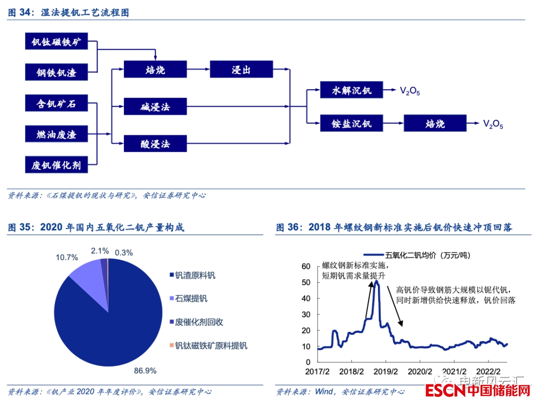 目前釩鈦磁鐵礦是主要的釩供給來源,未來石煤有望貢獻(xiàn)一定增量。我國釩資源主要以釩鈦磁鐵礦和含釩石煤兩種形式存在,其中石煤礦中釩的品味較低且提釩過程中污染較為嚴(yán)重,整體生產(chǎn)成本高于鋼渣提釩,目前國內(nèi)絕大多數(shù)釩產(chǎn)品來源于釩鈦磁鐵礦經(jīng)鋼鐵冶煉得到的富釩鋼渣(2020年占比超過85%)。考慮到鋼渣提釩的產(chǎn)出一定程度上取決于釩鋼產(chǎn)量,整體供給相對穩(wěn)定,我們認(rèn)為隨著全釩液流電池市場需求的增加以及技術(shù)的進(jìn)步,未來石煤提釩或?qū)⒇暙I(xiàn)一定的增量。例如2019年西部礦業(yè)在甘肅省肅北縣建設(shè)了國內(nèi)首條綠色石煤提釩環(huán)保生產(chǎn)線,一/二期已分別于2020/2022年投產(chǎn),目前可實(shí)現(xiàn)2000噸偏釩酸銨產(chǎn)能。因此,整體上看未來上游釩資源出現(xiàn)瓶頸的可能性相對較小,一方面?zhèn)鹘y(tǒng)鋼鐵領(lǐng)域的需求預(yù)計(jì)將保持穩(wěn)定甚至有所萎縮,另一方面釩資源的潛在供給來源較多,一旦釩價(jià)大幅上行(例如2018年螺紋鋼新標(biāo)準(zhǔn)實(shí)施后),鋼鐵行業(yè)可通過加大釩鈦磁鐵礦冶煉比例快速新增供給,高成本的石煤提釩亦可釋放一定產(chǎn)能,釩價(jià)難以出現(xiàn)大幅度、持續(xù)性的上漲。