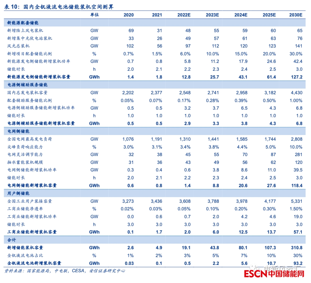 我們測算2025/2030年國內(nèi)儲(chǔ)能新增裝機(jī)規(guī)模有望達(dá)到107/311GWh,全釩液流電池潛在裝機(jī)空間或超10/90GWh。從結(jié)構(gòu)上來看,我們預(yù)計(jì)十四五期間新能源配套儲(chǔ)能將率先放量,電網(wǎng)側(cè)、用戶側(cè)儲(chǔ)能則將隨后大規(guī)模啟動(dòng),具體假設(shè)與測算如下。
