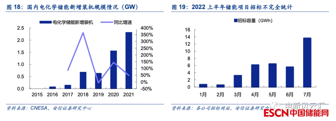 2022年國內(nèi)儲(chǔ)能行業(yè)正式步入發(fā)展快車道。2021年國家、地方層面均有儲(chǔ)能政策密集出臺,但主要側(cè)重在整體部署層面,相關(guān)的配套細(xì)則尚不完善,因此2021年為國內(nèi)儲(chǔ)能行業(yè)由商業(yè)化起步邁向規(guī)?;l(fā)展的過渡之年,實(shí)際落地的項(xiàng)目規(guī)模相對有限。根據(jù)CNESA的統(tǒng)計(jì),2021年國內(nèi)新增新型儲(chǔ)能裝機(jī)2.4GW/4.9GWh,較2020年同比增長約54%,其中電化學(xué)儲(chǔ)能裝機(jī)2.32GW,同比增長近49%。2022年上半年受制于疫情、原材料漲價(jià)等多方面因素的影響,國內(nèi)儲(chǔ)能項(xiàng)目建設(shè)節(jié)奏整體偏慢,但二季度起國內(nèi)儲(chǔ)能項(xiàng)目招標(biāo)已集中啟動(dòng),根據(jù)我們的不完全統(tǒng)計(jì),在排除無法取得具體招標(biāo)規(guī)模的項(xiàng)目后,今年上半年國內(nèi)儲(chǔ)能(不包括抽水蓄能)總計(jì)招標(biāo)容量已經(jīng)達(dá)到8GW/22GWh以上(主要統(tǒng)計(jì)EPC、儲(chǔ)能集成系統(tǒng)以及相關(guān)設(shè)備),其中二季度合計(jì)招標(biāo)量超18GWh,招標(biāo)規(guī)模較一季度明顯提升。經(jīng)過上半年的觀望與前期準(zhǔn)備,我們預(yù)計(jì)下半年起國內(nèi)儲(chǔ)能項(xiàng)目建設(shè)速度將明顯加快,僅7月我們統(tǒng)計(jì)到的國內(nèi)儲(chǔ)能項(xiàng)目招標(biāo)規(guī)模就已超過13GWh(包括南網(wǎng)科技、華電等框架性協(xié)議)。
