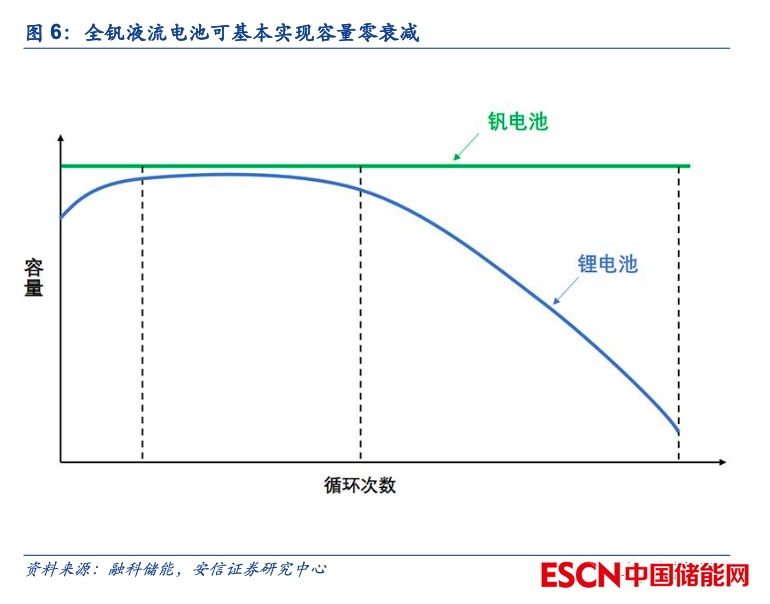 全釩液流電池循環(huán)次數(shù)明顯優(yōu)于鋰離子電池,且生命周期內(nèi)容量可完全恢復(fù),生命周期內(nèi)度電容量可利用率高。一方面,全釩液流電池使用不同價(jià)態(tài)的釩離子作為電池的活性物質(zhì),反應(yīng)過程僅為釩離子的價(jià)態(tài)變化,不涉及液固相變,且克服了電解質(zhì)交叉污染的問題;另一方面,全釩液流電池的在充放電過程中電極材料不參與電化學(xué)反應(yīng),屬于惰性電極,電極和雙極板等材料穩(wěn)定性好,不涉及更換;此外,針對全釩液流電池因電解液在正負(fù)極之間的遷移和副反應(yīng)造成的釩離子價(jià)態(tài)失衡帶來的容量衰減問題,一般可以通過低成本的物理和化學(xué)手段進(jìn)行恢復(fù)。因此,全釩液流電池理論上具備極長的循環(huán)壽命,而從早期項(xiàng)目的實(shí)證情況來看,全釩液流電池長壽命的優(yōu)點(diǎn)亦得到了充分驗(yàn)證。例如住友電工2005-2007年實(shí)施的4MW/6MWh全釩液流電池系統(tǒng)配合風(fēng)場在三年間進(jìn)行了20多萬次的充放電,大連融科與國電龍?jiān)春献魍哆\(yùn)的5MW/10MWh全釩液流電池系統(tǒng)從2012年12月并網(wǎng)至今已有9年多的日歷使用時(shí)間,效率和容量均未見衰減。相較而言,目前磷酸鐵鋰電池的循環(huán)次數(shù)僅為5000-10000次,若考慮到儲(chǔ)能系統(tǒng)中電芯一致性的問題,則系統(tǒng)層面的循環(huán)壽命往往更低,同時(shí)鋰離子電池的可用容量亦會(huì)隨著循環(huán)次數(shù)的增加而明顯下降。因此,我們認(rèn)為從全生命周期的角度來看,全釩液流電池具備一定的優(yōu)勢。