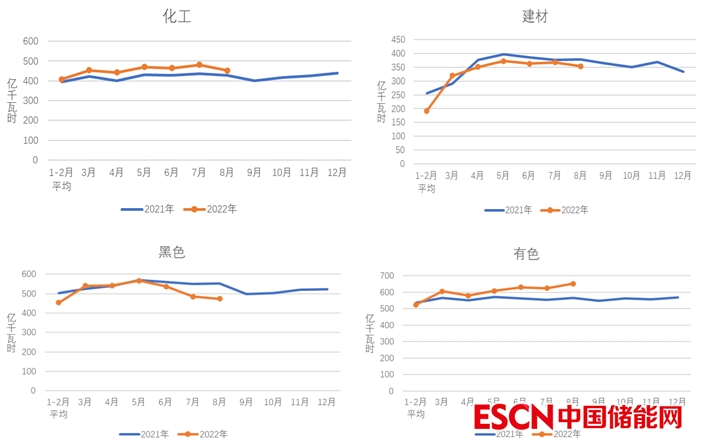 圖4 2021、2022年重點(diǎn)行業(yè)分月用電量情況